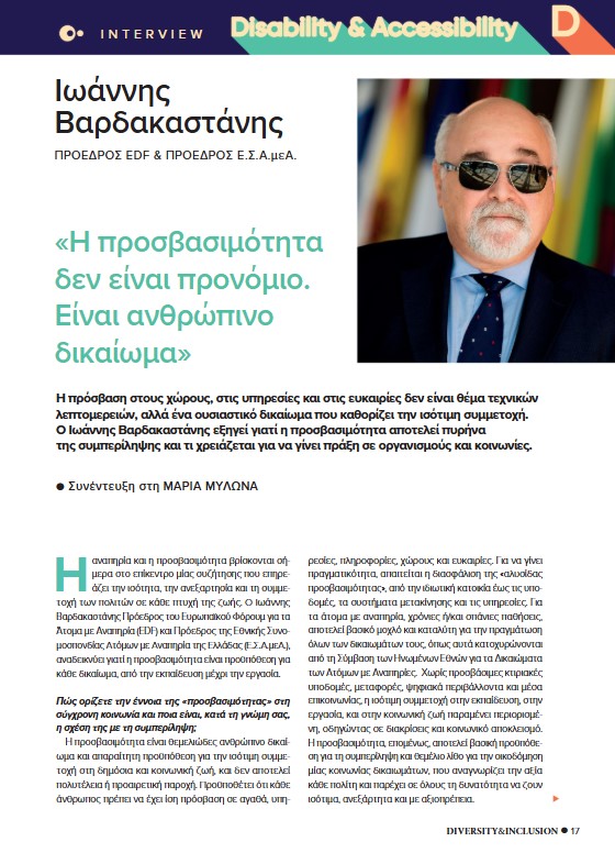 Στην ηλεκτρονική έκδοση του "The D&I Dictionary", όπως και στο HR Professional φιλοξενείται η συνέντευξη του προέδρου της ΕΣΑμεΑ Ioannis Vardakastanis "Η προσβασιμότητα δεν είναι προνόμιο. Είναι ανθρώπινο δικαίωμα".